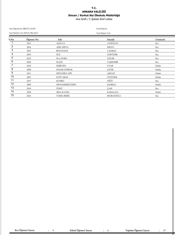 2025-2026 Eğitim Öğretim Yılı Ana Sınıfı Öğrenci Listesi